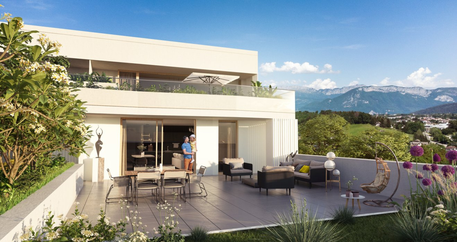 Résidence à l’architecture contemporaine, élégante et volontairement épurée dans sa volumétrie, de teinte claire, mélangeant minéralité, bois et métal, les extérieurs offrent aux logements des balcons et terrasses ouvertes sur de grands paysages. La végétation, largement présente, « coule » entre les bâtiments. Les toitures végétalisées viennent parfaire cet environnement verdoyant à côté de la ville d'Annecy.