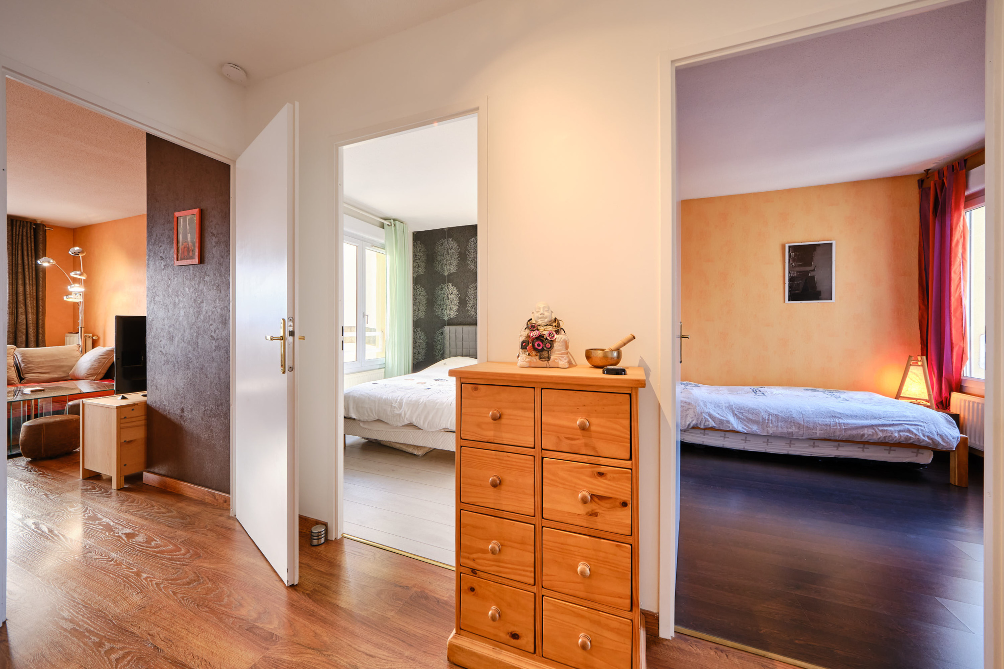 Traversant, le coin nuit est composé de 3 chambres avec placards, une salle de bain et un wc.